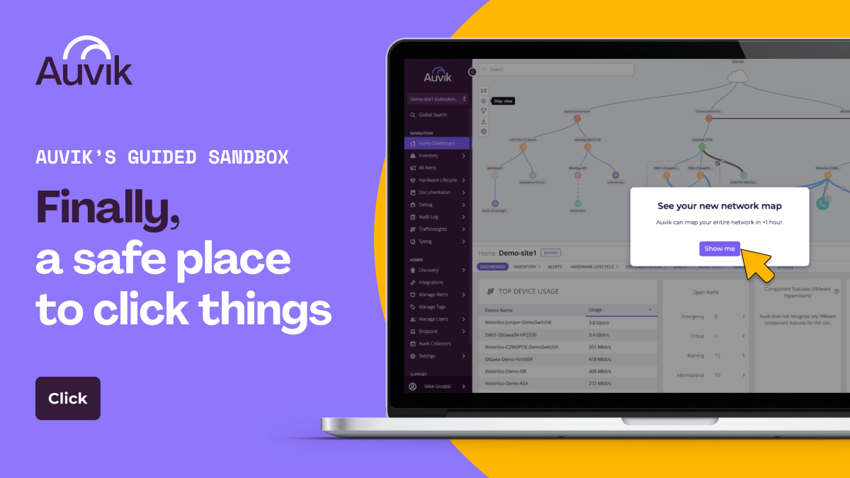 Enter Auvik’s Guided Sandbox, a safe demo environment where you can explore, click, and tinker to your heart’s content without accidentally nuking production.
